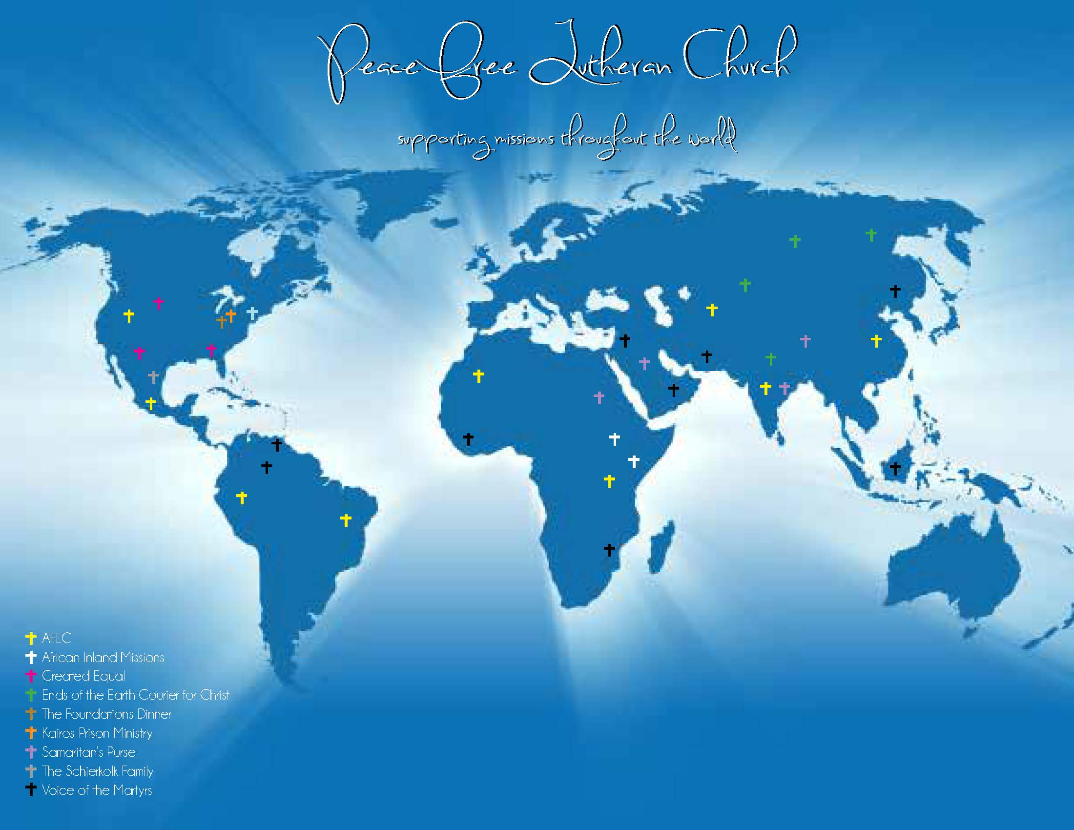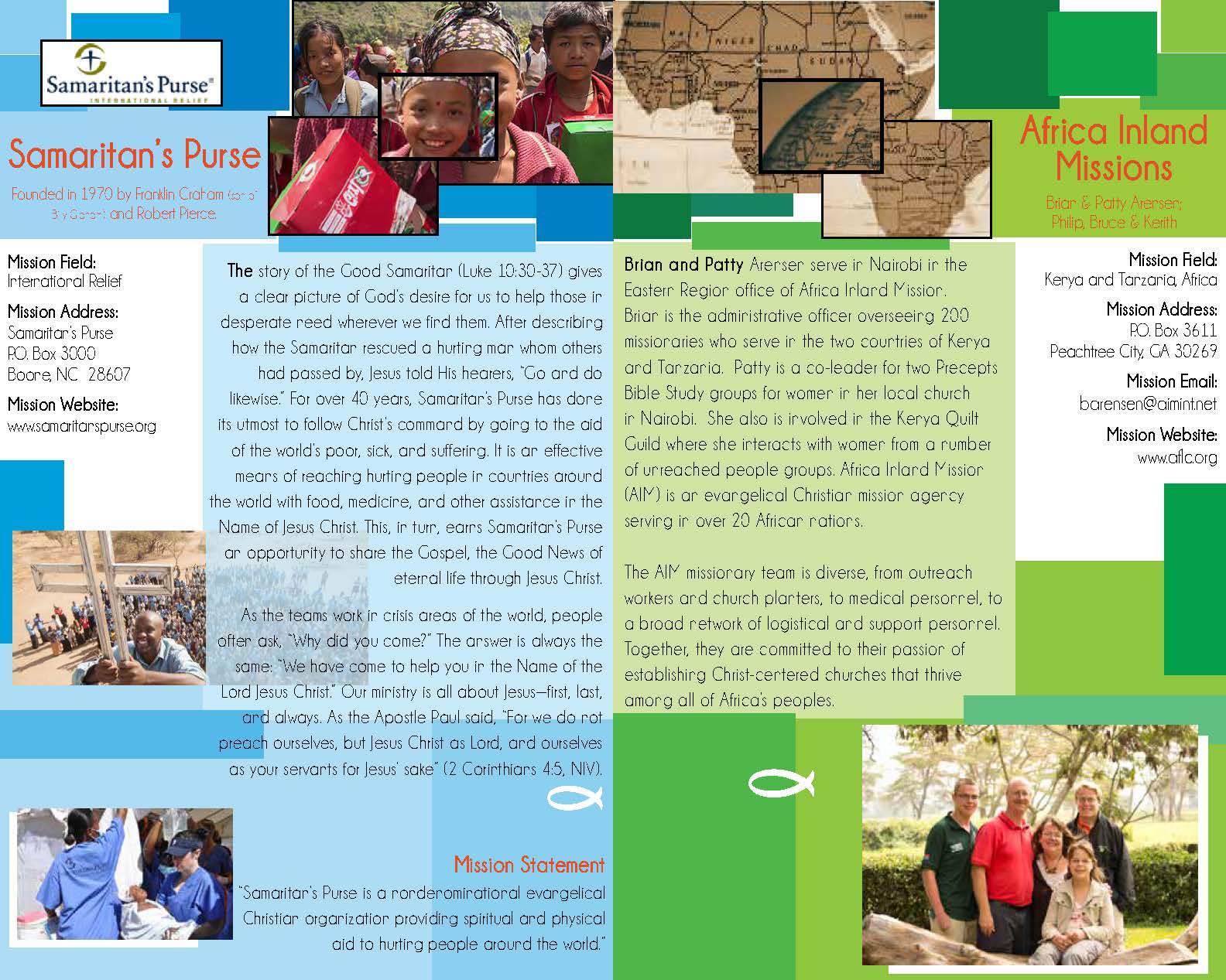 This brochure was created to inform the members of the church congregation the charities where their monetary contributions are received. The brochure also provides more information about each charity and the contact information for each one.
